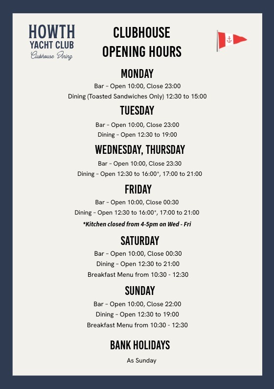 At Howth Yacht Club, we’re delighted to offer a spacious dining area with stunning views of Howth Harbour, a unique horseshoe bar with window seating, and a cozy snug for added privacy.