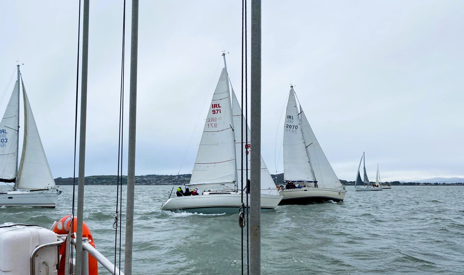 St Brigid was clearly in a foul mood for Sundays second Brass Monkeys race, sponsored by Tadg Riordan Motors, forcing most sailors into full wet gear. She did, however, make amends by delivering a healthy 15-knot breeze — though she remained frustratingly indecisive about exactly where it should come from.