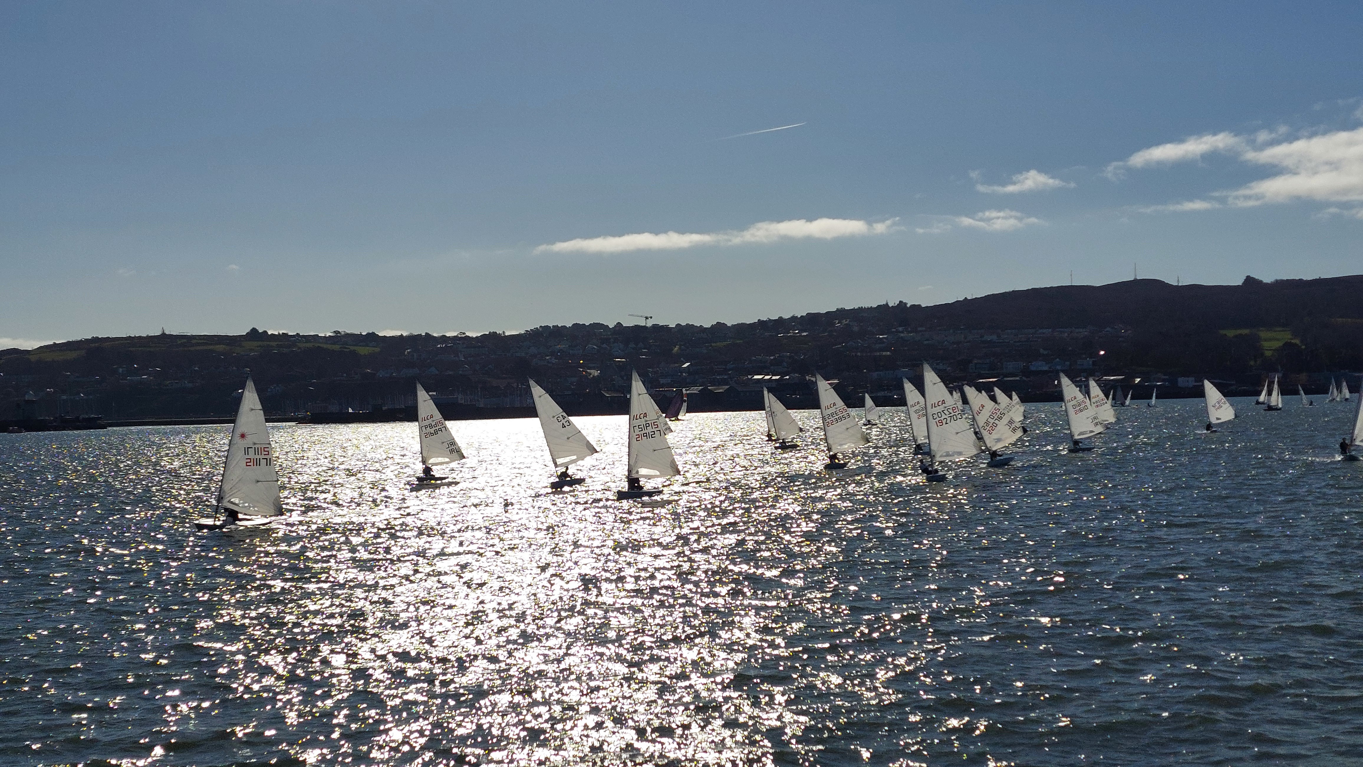 Both fleets got away cleanly at the first attempt. A short upwind leg in the puffy and shifty breeze coming off Howth Head was followed by a run to a turning mark, which served as the final decision point where sailors had to commit to their chosen direction around the Island. The leaders in both fleets opted for the anti-clockwise route and, while the majority of both the ILCA and PY fleets followed suit, a number of competitors decided to brave the opposite direction.