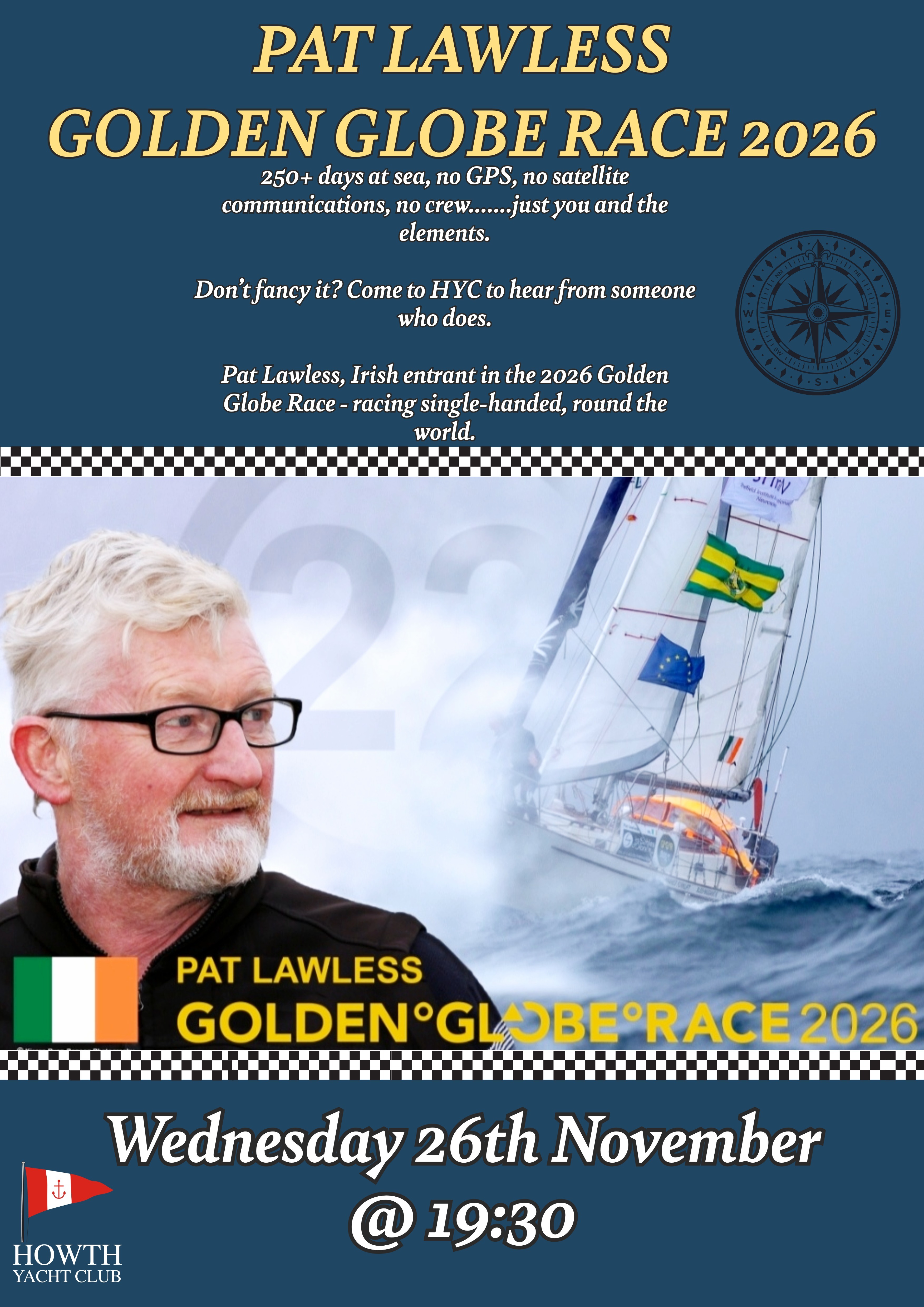 On Wednesday 26th November, Pat returns to Howth Yacht Club to share his preparations for the 2026 start from Les Sables d’Olonne. He’ll be introduced by Paddy Barry and will show film and photos of life at sea and managing storms.