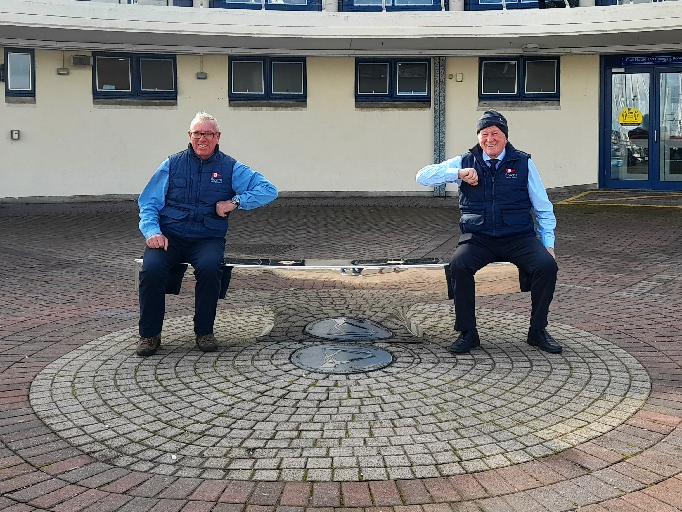 Pictured below is our Commodore Ian Byrne and Vice-Commodore Paddy Judge enjoying the view from Grant Mac Ewan’s magnificent, oversized Cleat Sculpture ‘Release’ which meets the recommended 2 metre Social Distancing which has become part of our daily life.