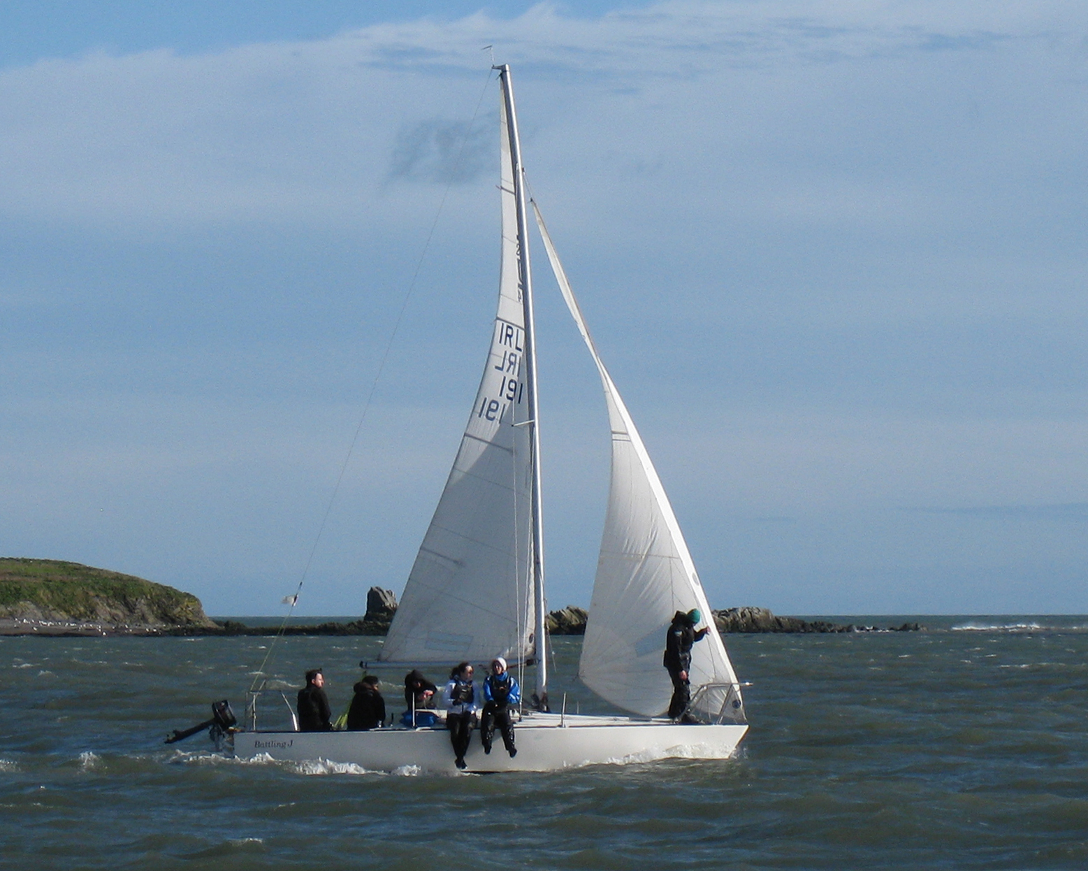 Day 4 of the Brass Monkey Spring Series, sponsored by Tadg Riordan Motors, got underway under typical winter uncertainty, with early morning rain prompting the North Star crew to don their wet weather gear once again. As the course was set, conditions improved, revealing a fresh West to Southwest breeze of 15 knots and a reasonably flat sea, with gusts reaching 20 knots. Race officials opted for Course No. 14, and all fleets managed a clean start on the ebbing tide.