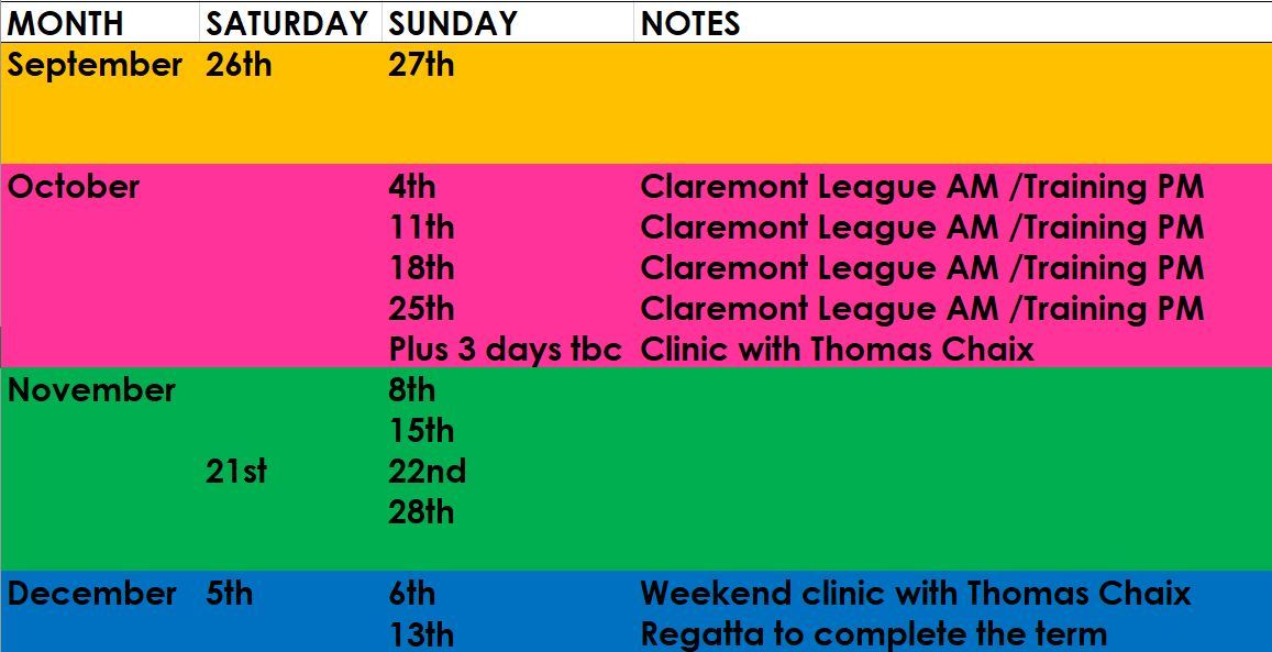 The lead coach will be Thomas Chiaix of Dinghy Performance. Thomas will provide mentoring / supervision to all of his team involved in the training. The coaches will all be members of Dinghy Performance training team. Lead coaches who have signed up include Adam Darcy and Dylan Reidy. All coaches and assistants have been endorsed by Thomas Chaix. The coaches will stream the group according to ability to create a stronger group and promote individual progress